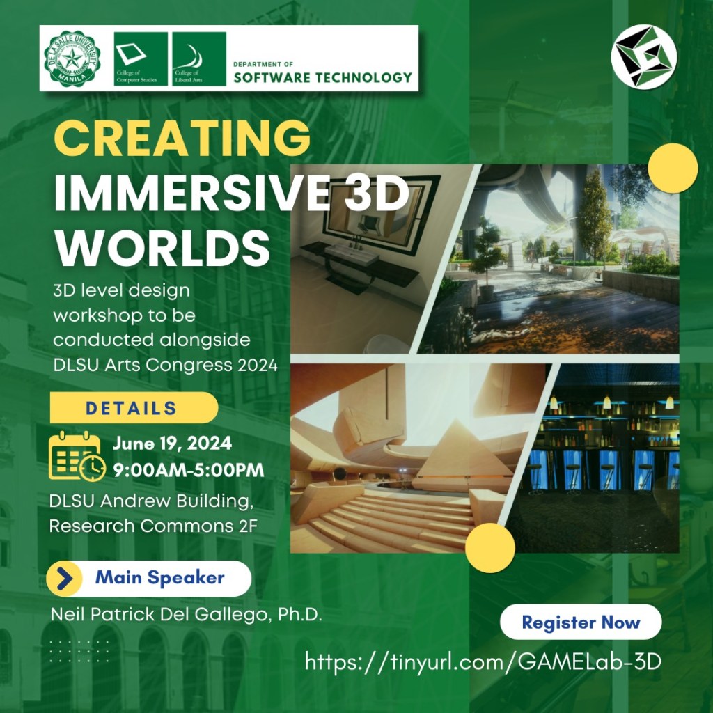 This workshop is conducted by Dr. Neil Patrick Del Gallego of DLSU Software Technology and organized by the DLSU College of Computer Studies. Neil is also the head of the Graphics, Animation, Multimedia, and Entertainment (GAME) lab at DLSU CCS.