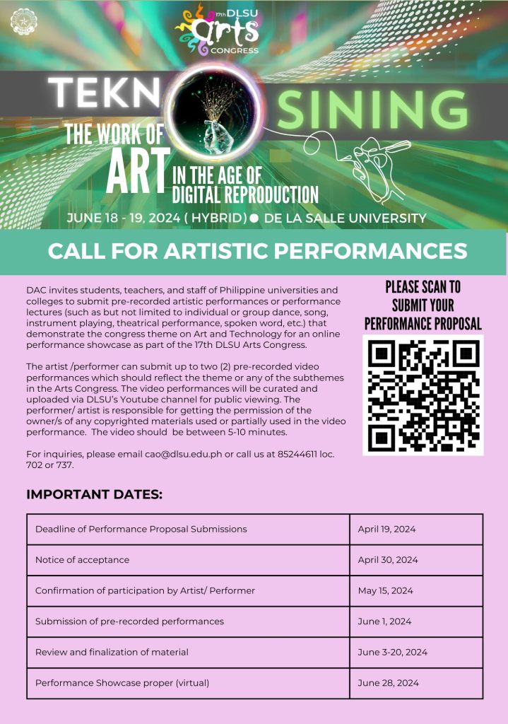 For more information, please check out our announcement below. You may also contact cao@dlsu.edu.ph (for the performances), and deborah.magpantay@dlsu.edu.ph (for the artworks).